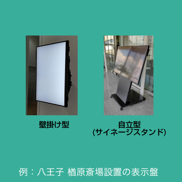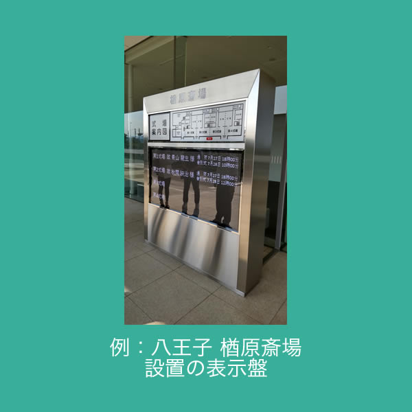 | 2 | <屋内>案内表示 | 斎場建屋入口付近へ設置いたします。 | 有線LANまたはWiFi接続 |
